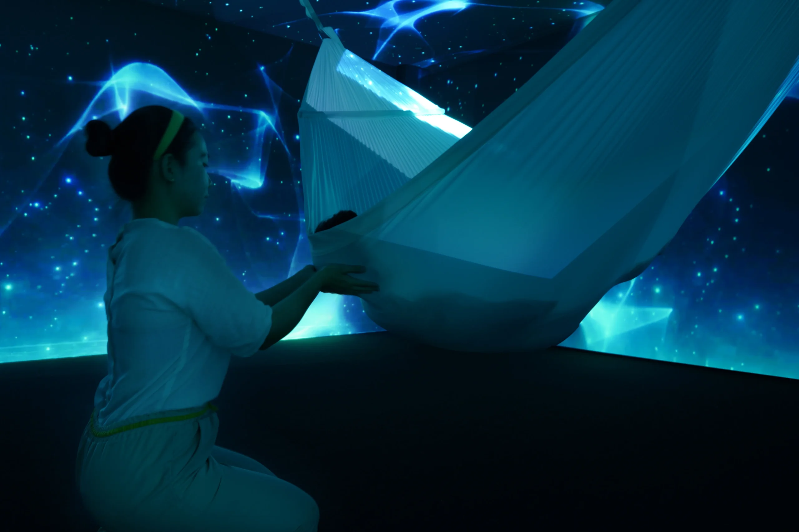 Through guided swaying, assisted stretching, and restorative hands-on work, the practitioner helps decompress the spine, ease joint tension, and support the body’s natural energy flow. This bodily easing is complemented by a three-dimensional lightscape that subtly shifts in form and tone, enhancing spatial awareness and soothing the nervous system. The result is a quiet yet powerful reset – supporting improved sleep, mental clarity, and overall balance.